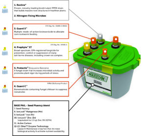 HT MaxStax Corn includes the Prephyte ST biofungicide, the bioinsecticide Guard X, the Guard C bionematicide, the Protectis beauveria bassiana microbe, Revline biostimulant and N-fixing microbes, in addition to the base pail of seed fluency and IonLock™ Zn, Fe & Mn with Ether Enzyme Technology and active carbon.
