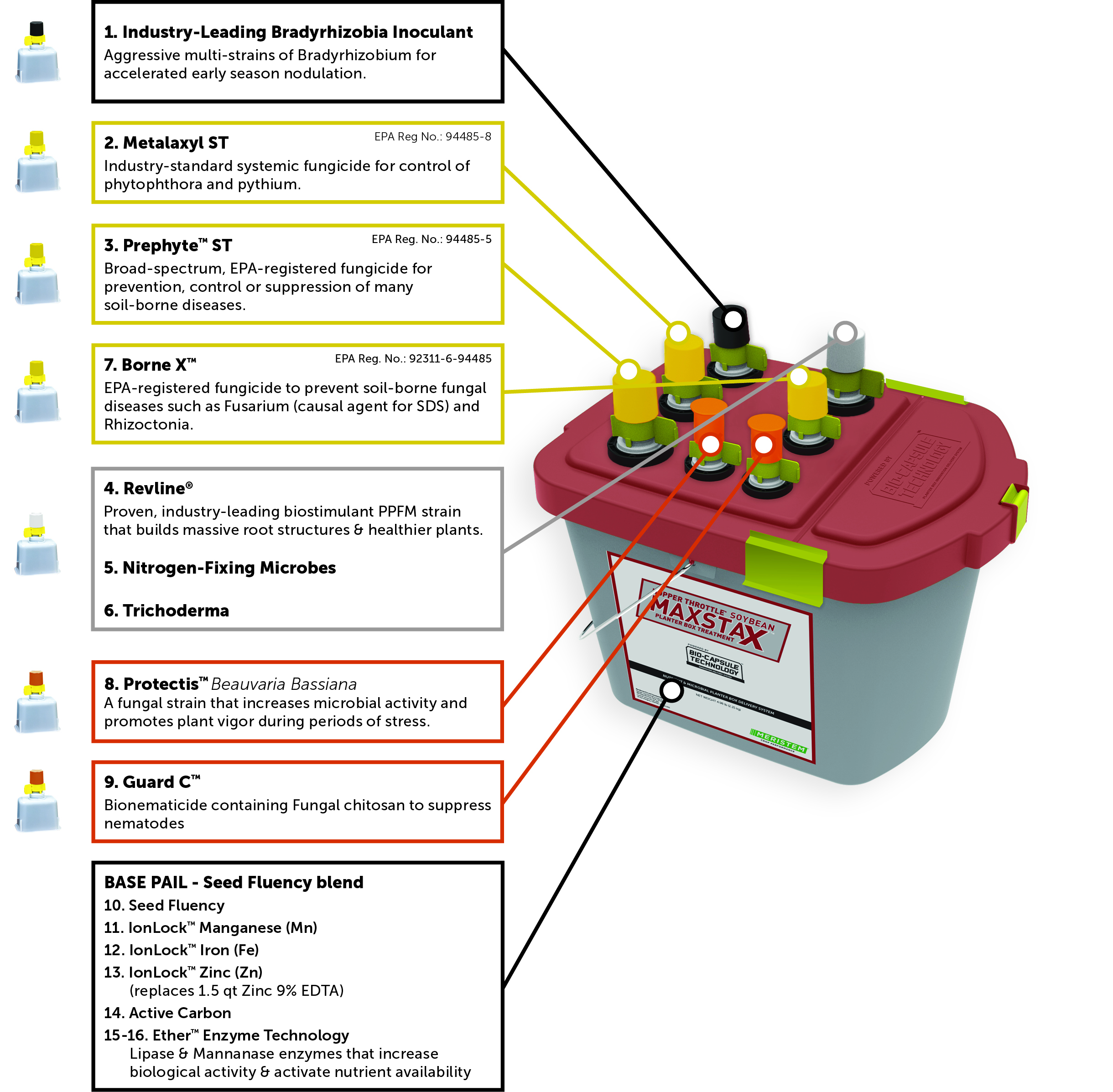 A revolutionary combination of 16 crop inputs, HT MaxStax soybean includes a multi-strain bradyrhizobia inoculant, Metalaxyl ST, the Prephyte ST and Borne X biofungicides, the bioinsecticide Guard X, the Guard C bionematicide, the Protectis beauveria bassiana microbe, Revline biostimulant, N-fixing microbes and trichoderma, in addition to the base pail of seed fluency and IonLock™ Zn, Fe & Mn with Ether Enzyme Technology and active carbon.