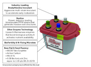 Revline® Hopper Throttle® Soybean Ether™ is an advanced planter box system that combines seed fluency, micronutrients and live biology in a convenient delivery system that can replace any seed fluency agent.